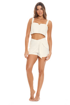 Our Crudo Set is made with a lightweight and fresh fabric that doesn't wrinkle. The top features a square silhouette with "v" neckline and buttons at the back. The shorts have a smooth waistband at the front and elastic waistband at the back with a wraparound silhouette to tie at the front. A stylish and loose-fitting piece that creates a statement in your look. Wear it over our swimsuits or as a romantic and casual look.
