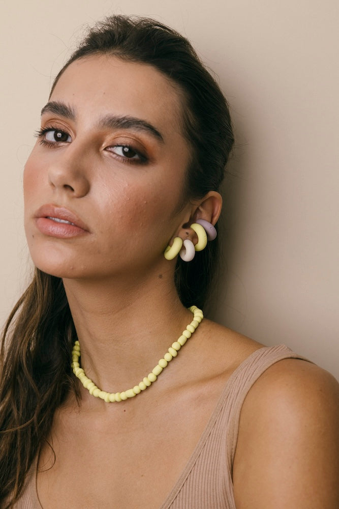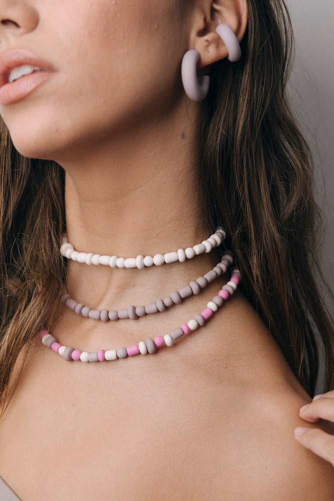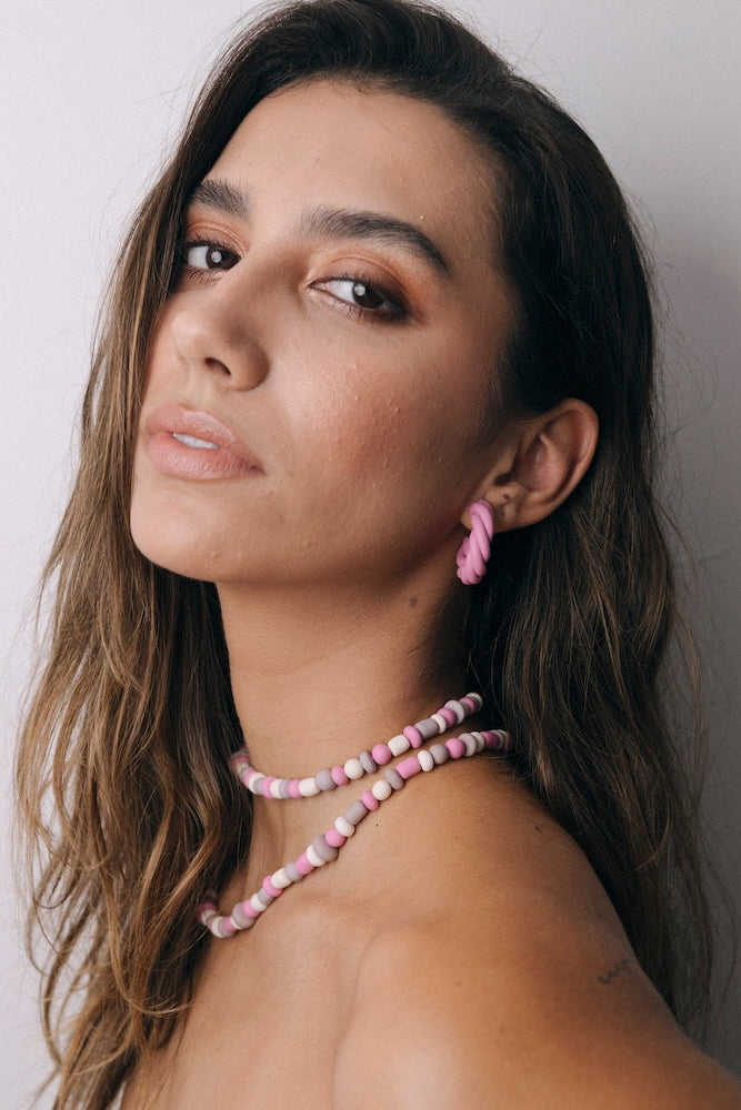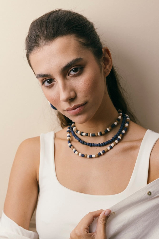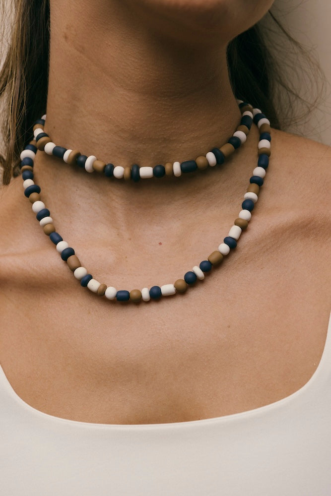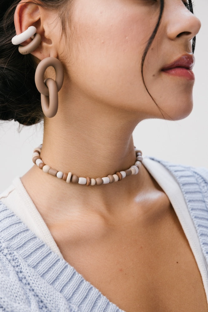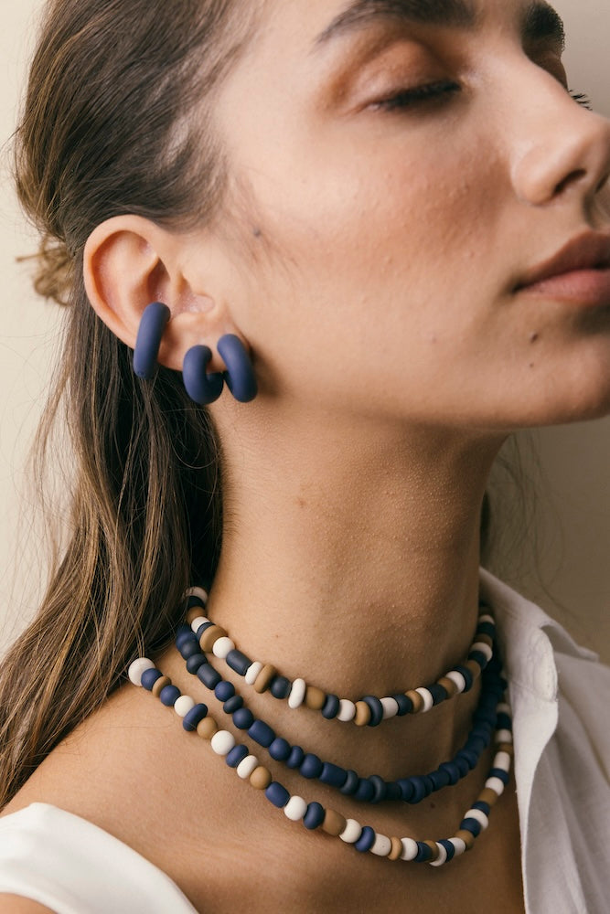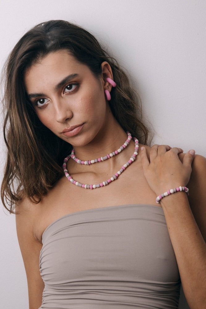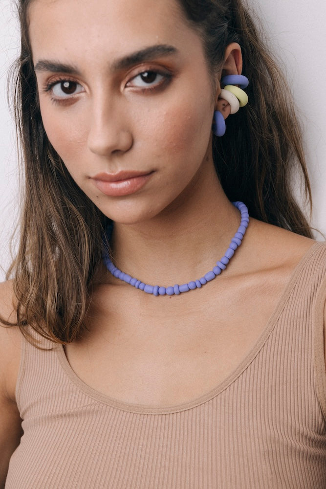 | Our timeless Choker gives a glamorous touch to your look. Wear it alone or combine it with other necklaces to make a unique layering. It can also be worn as a double bracelet. This handmade and unique piece is crafted from polymer clay, in a process full of dedication and love that starts combining different shades to get the desired colour. Then, rolling, cutting and shaping bring to life beautiful elements that after baked, are ready to compose a stunning piece. Since each bead and element is handmade, every piece is unique. Details of the craftsmanship can be seen, and colour and shape may variate. |