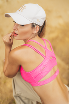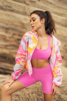 Our Fucsia Sports Bra is your new go-to choice when working out. With an elastic fabric that offers support, ideal for practicing moderate impact sports. A stunning colour with a fragmented look. Pair them with our Fucsia Biker or our Fucsia Print Shorts.