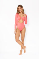 Our Coral one piece is a swimsuit full of elegance that also protects your arms and back from the sun. Thanks to its twisted neckline and shiny base, you will stand out wherever you go.