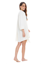 Our Crudo Kimono is a versatile and romantic piece. It features a light and fluid fabric that doesn't wrinkle. Its design allows you to wear it open or tied at the front. The perfect choice to wear over your swimsuits or even as a casual shirt, elevating your outfit.
