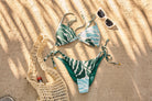 A reinvented triangle top with a new silhouette featuring fixed, very thin, and comfortable cups that provide maximum comfort, while shaping the bust. The bottom is knotted on the sides and has a back scrunched seam that shapes the glutes for a more contoured silhouette with a push-up effect. This piece features a unique print, becoming a must have for your collection.