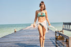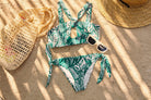 A new top silhouette that you are going to love. It has a knot and lock neckline, with straps that go from the neckline knot to the back, wide and comfortable. It has removable cups for better support and a stunning print. You can also wear it as a crop top for many outfits. The bottom is a classic silhouette with side ties that help balance the volume of the hips. with medium coverage and a stunning print for an elevated look.